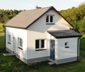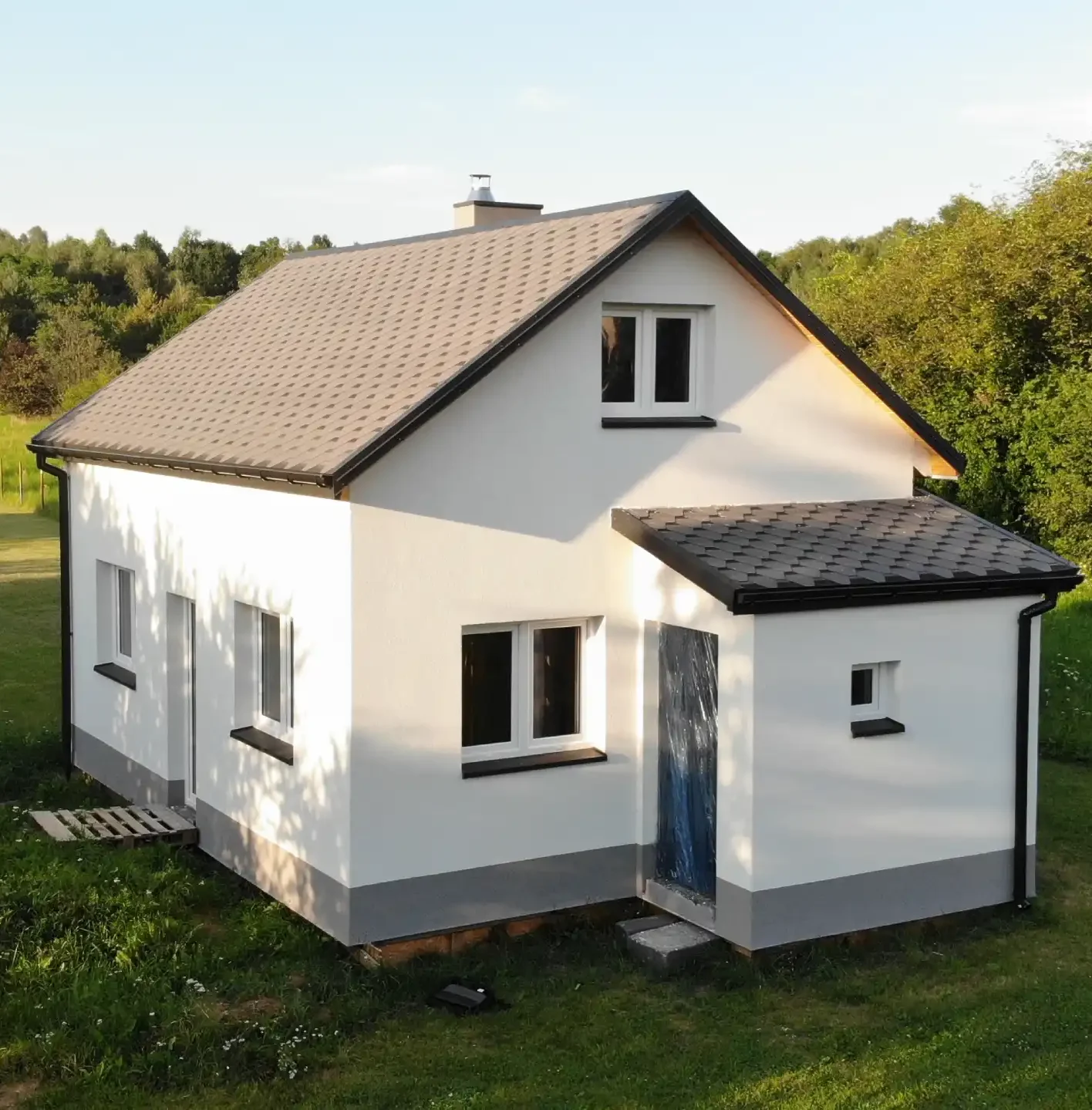 Pokrycie ścian zewnętrznych z płyty Steico Protect 60mm. Dodatkowo tynk silikonowy w wybranym kolorze.