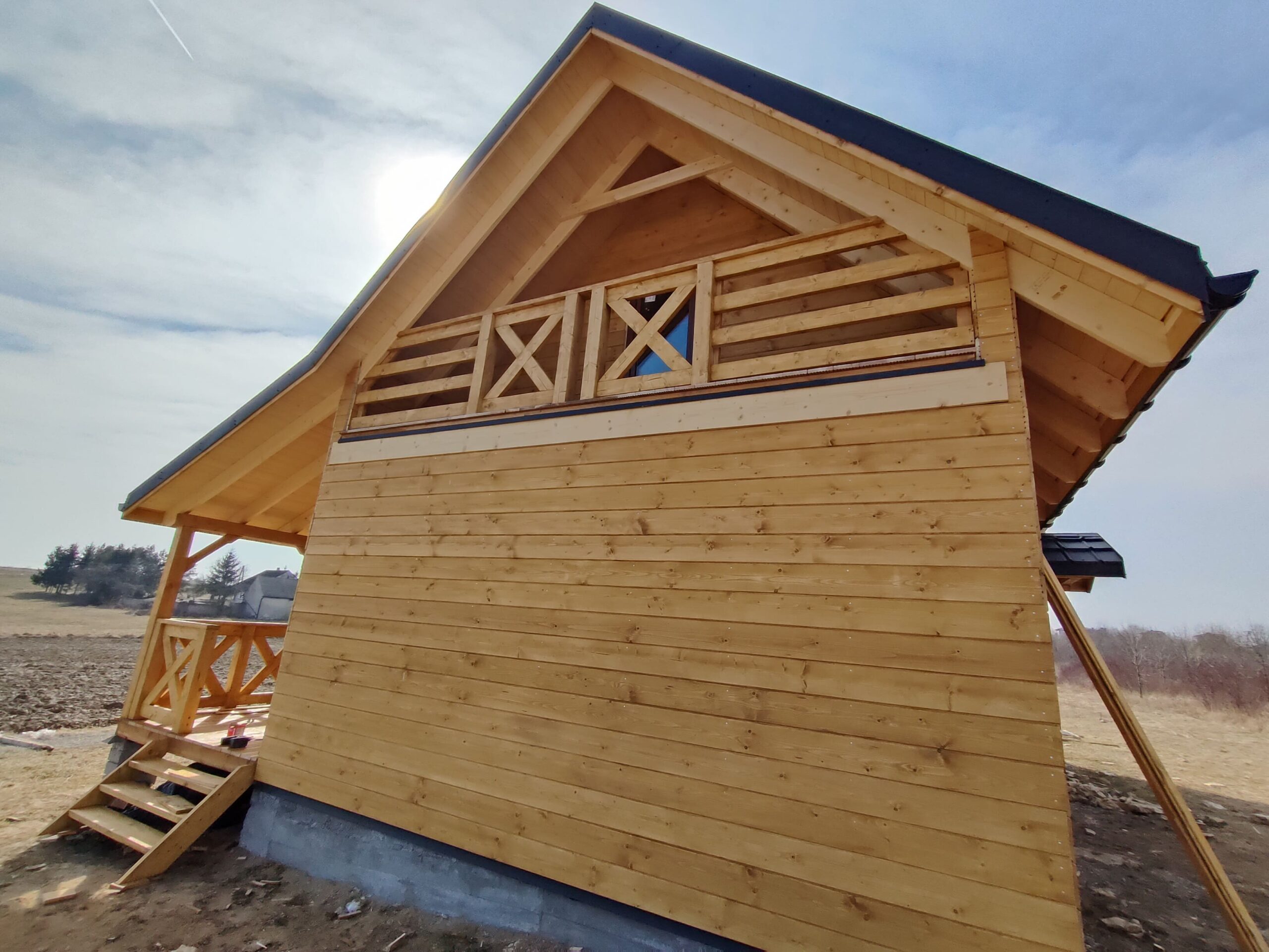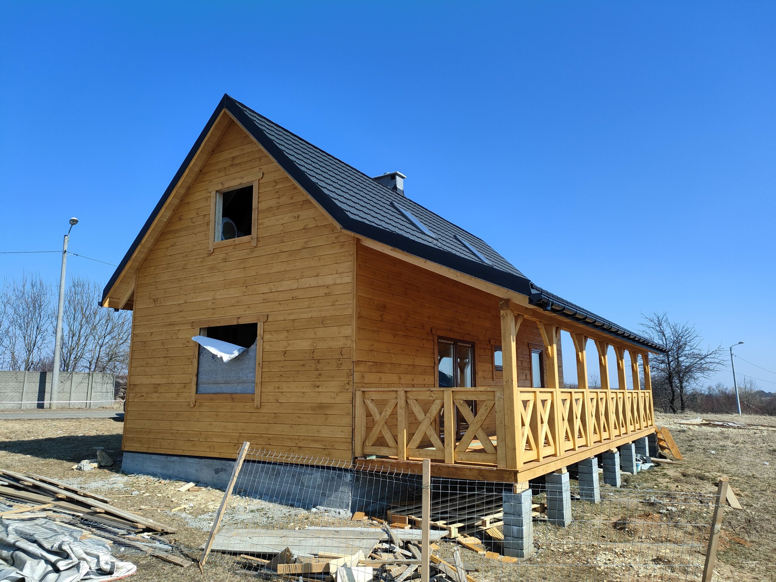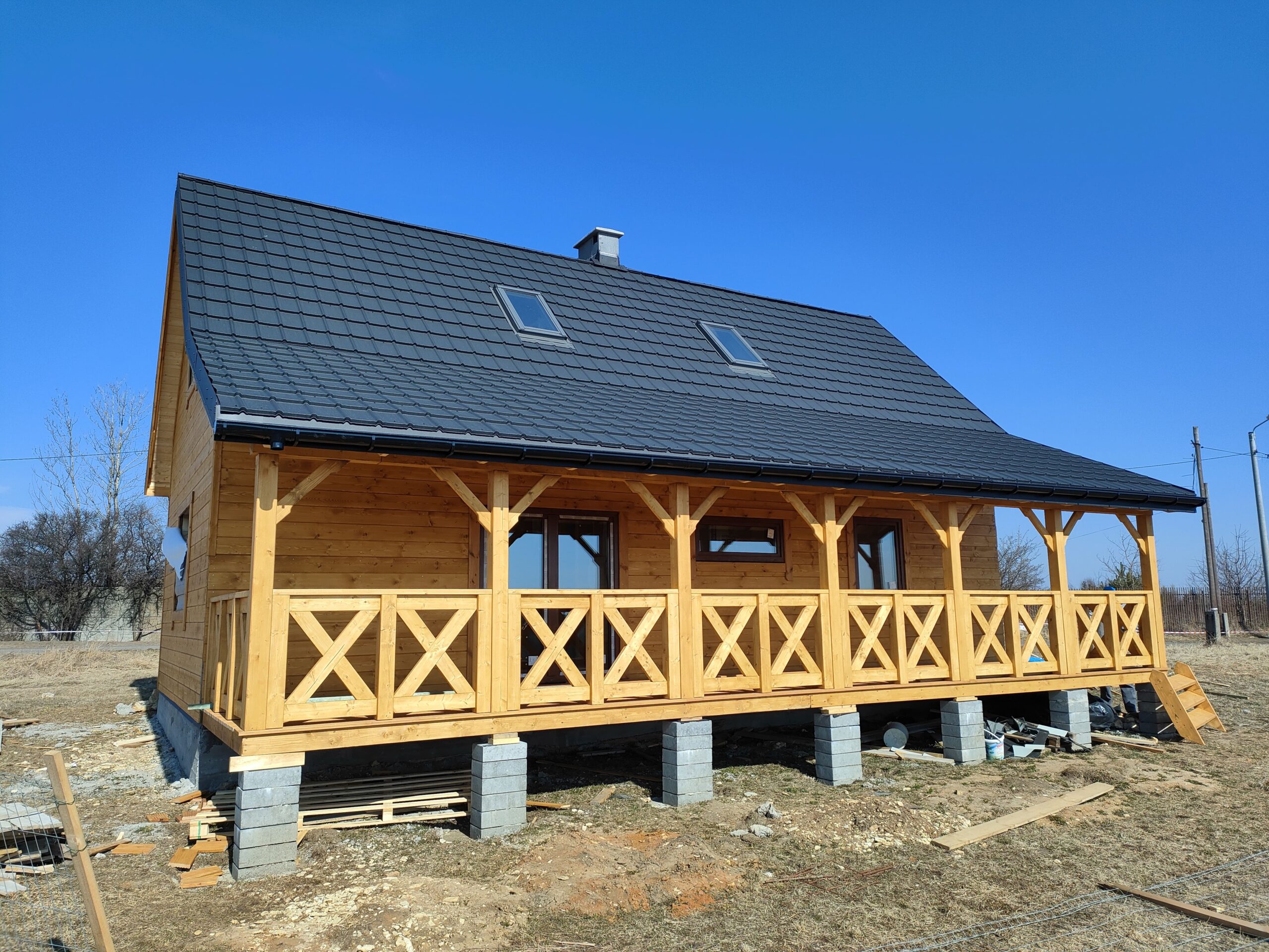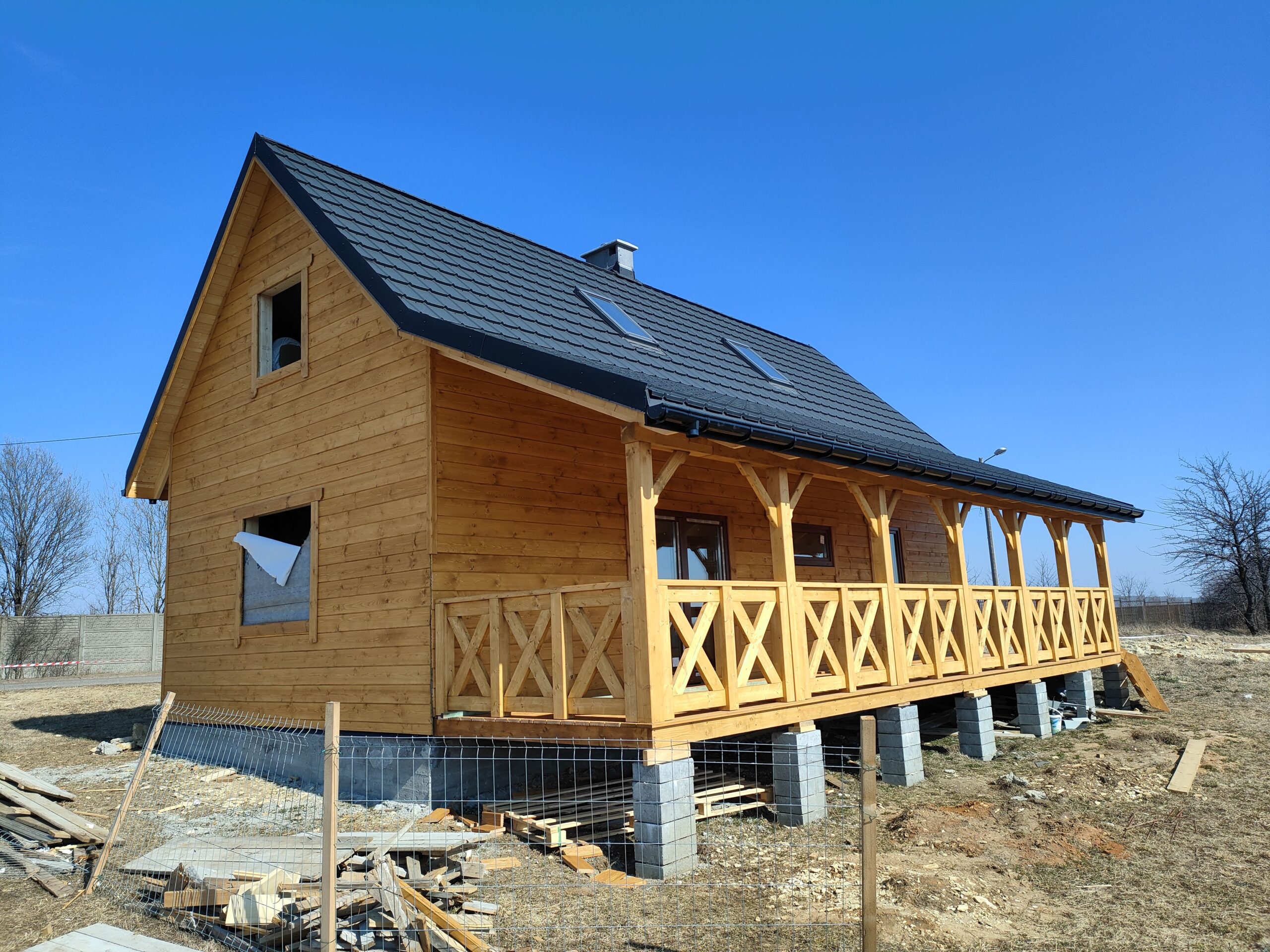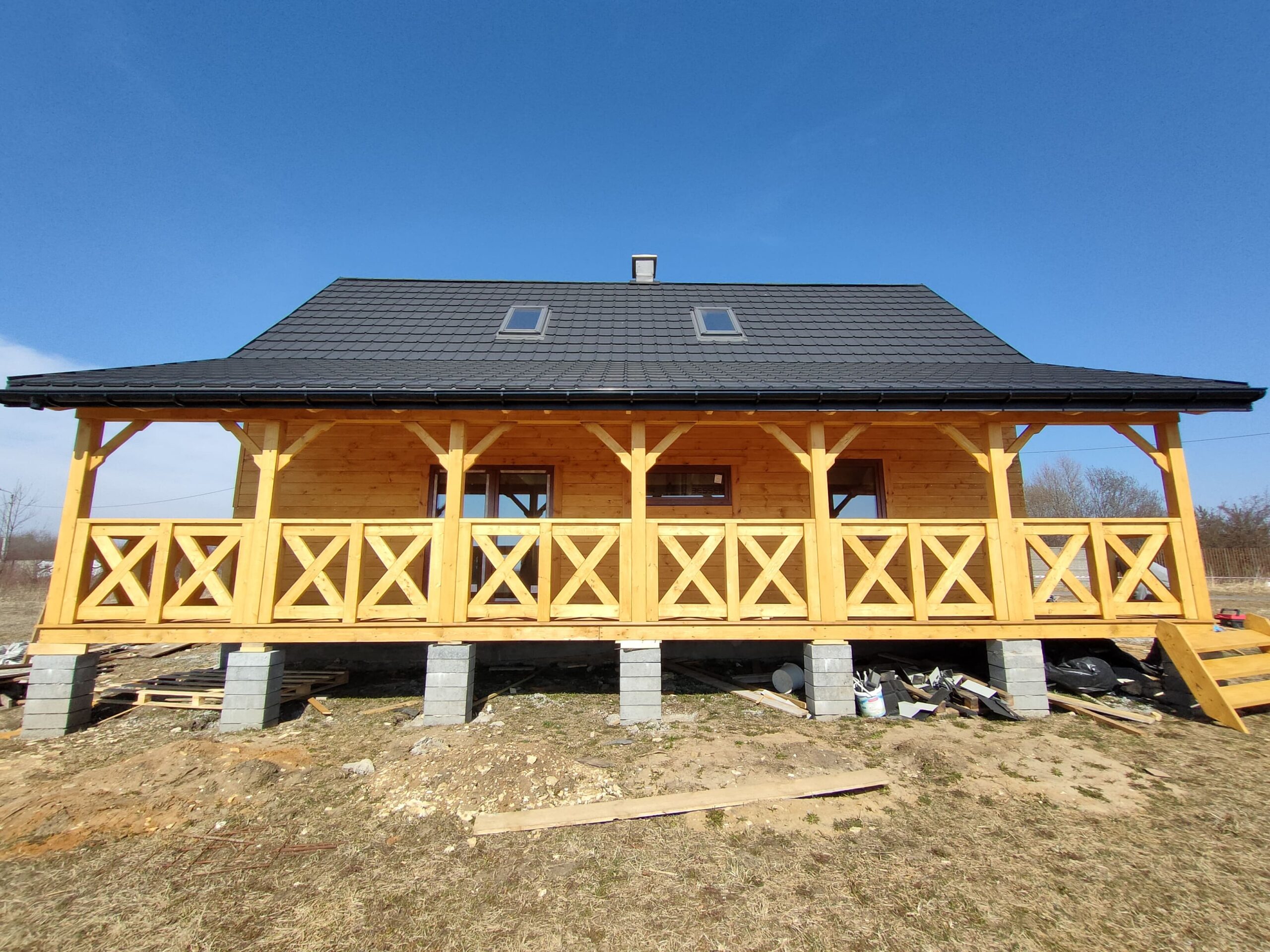 Konstrukcja domu wykonana z drewna świerkowego klasyfikowanego C24 o przekroju 45x145mm /dach 45x195mm