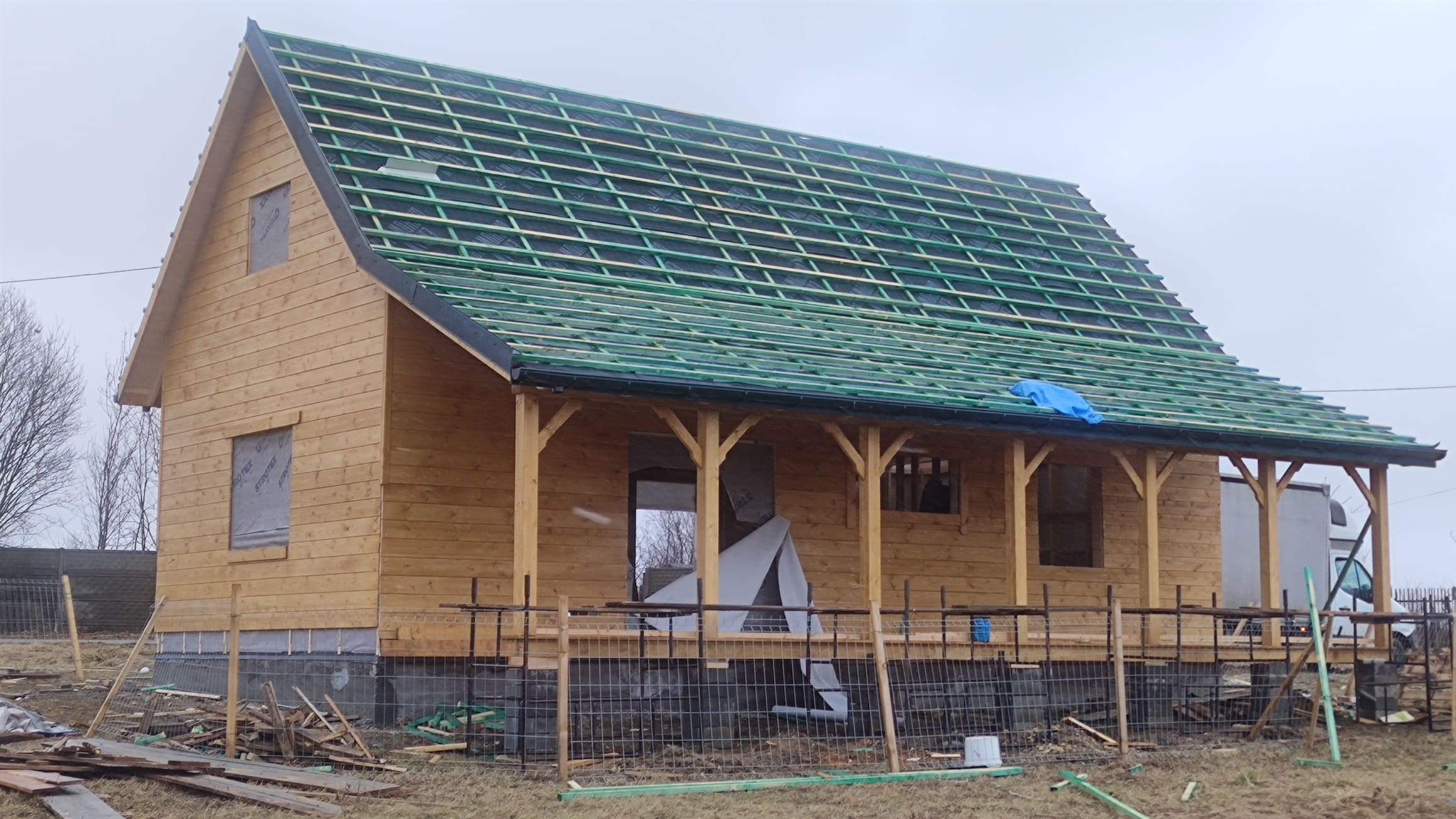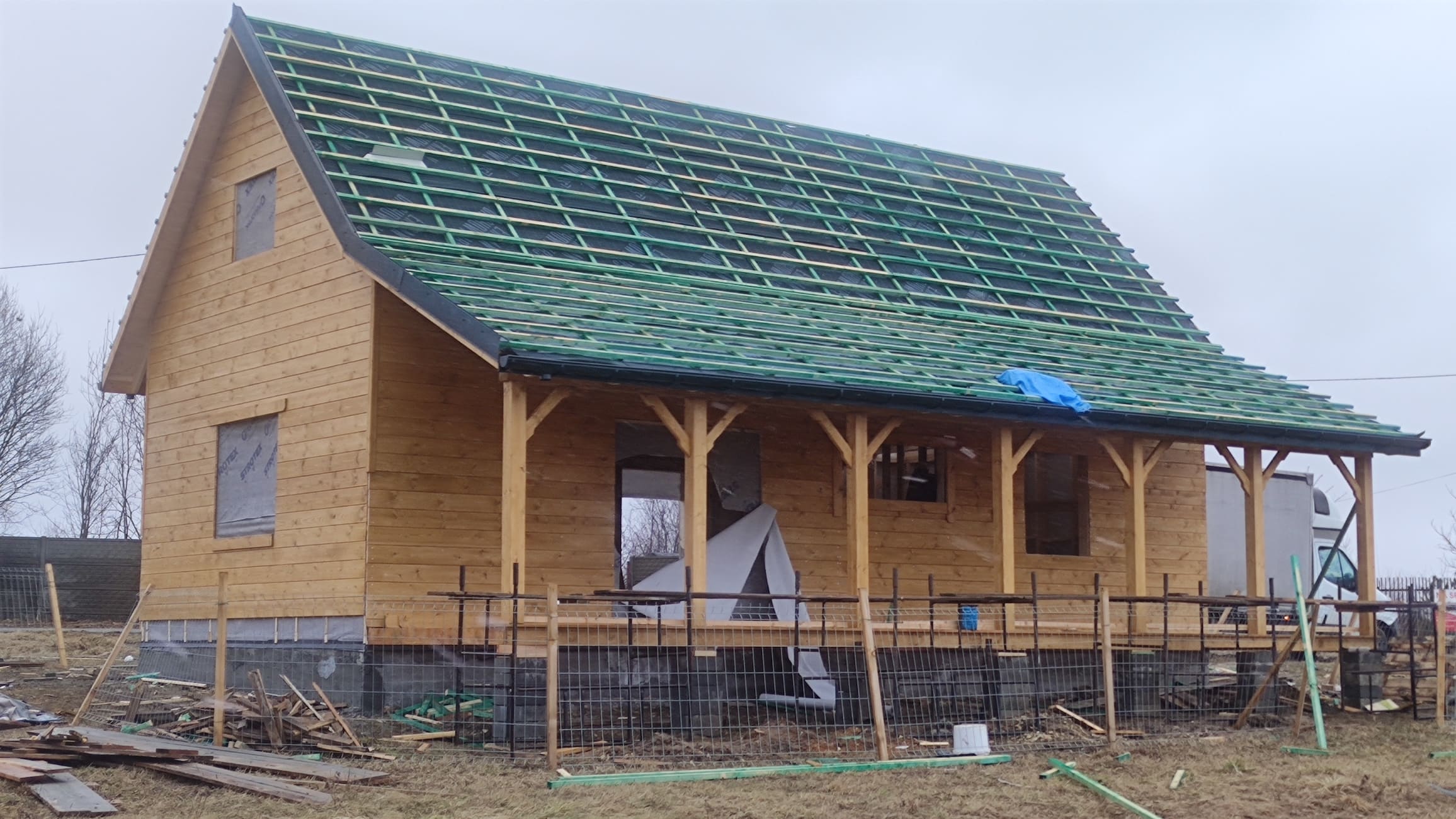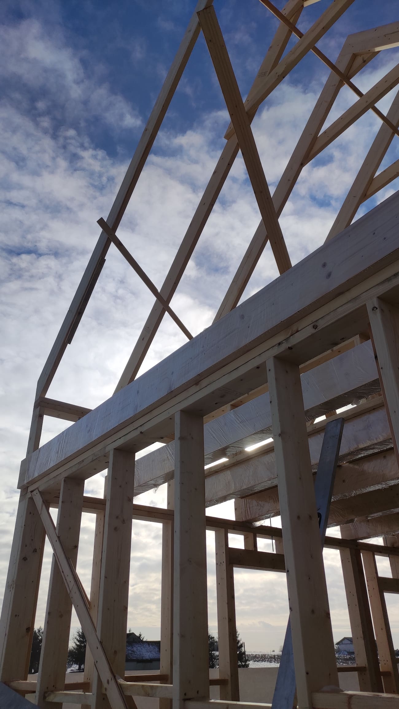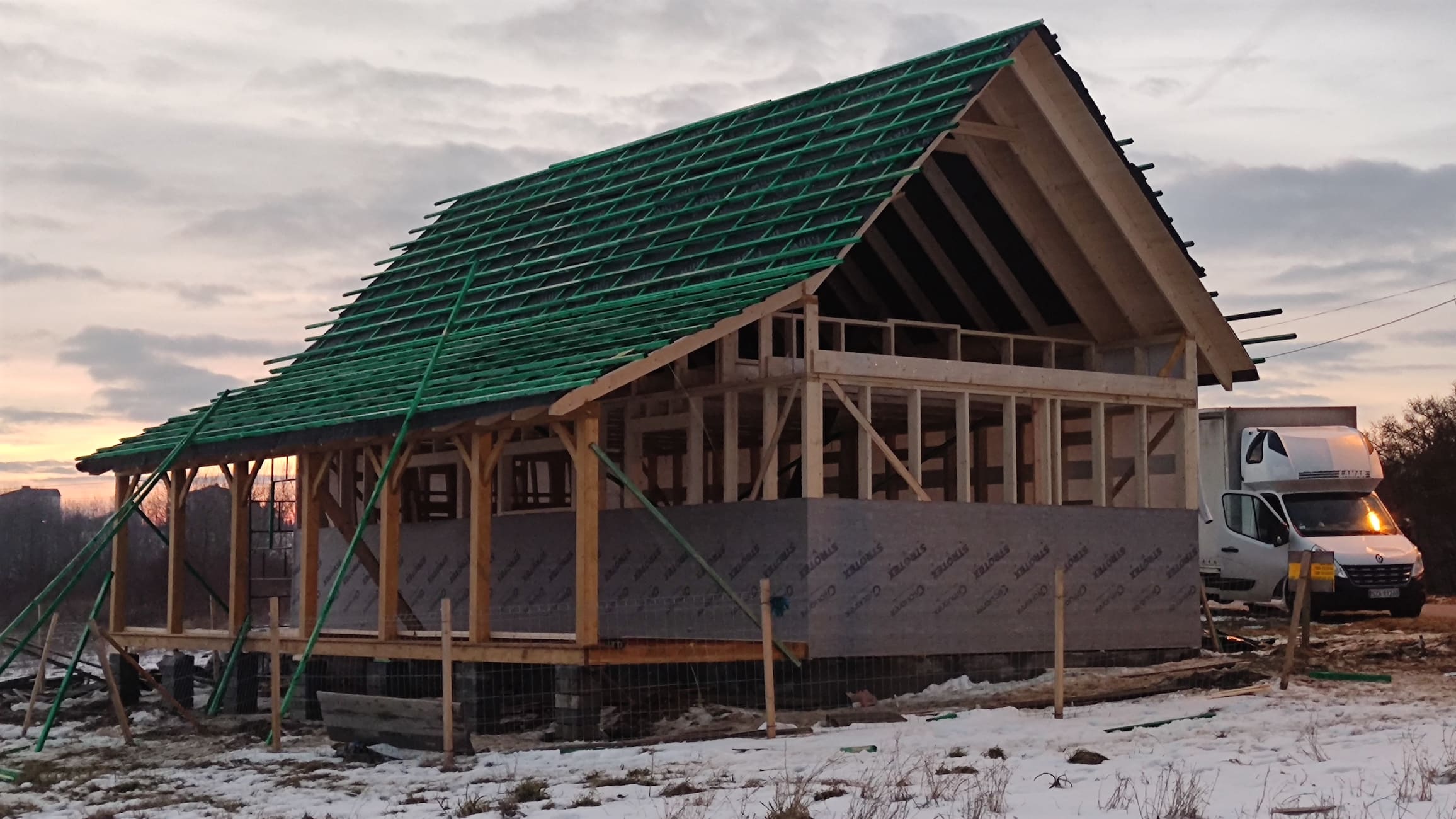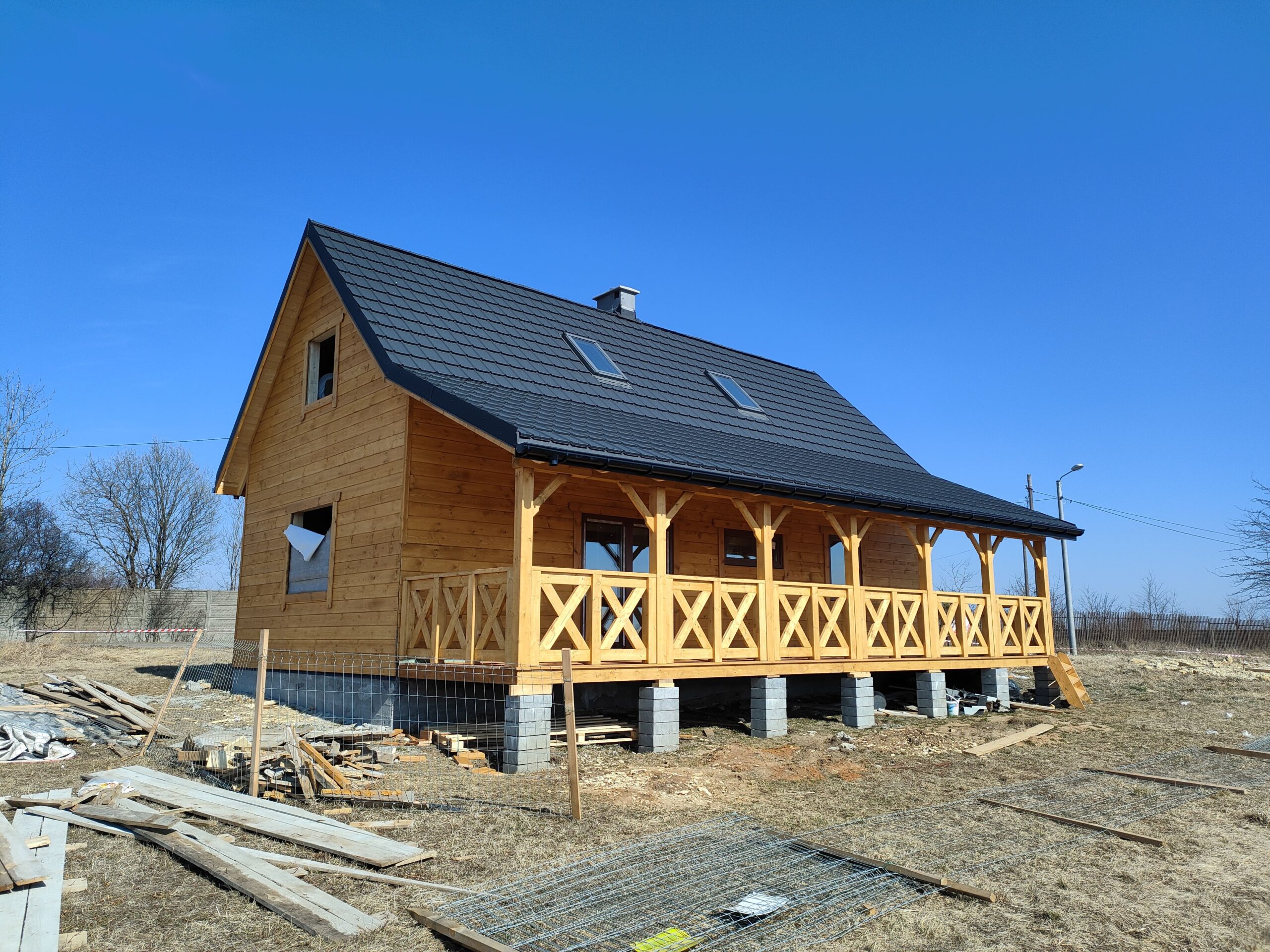 Konstrukcja domu wykonana z drewna świerkowego klasyfikowanego C24 o przekroju 45x145mm /dach 45x195mm