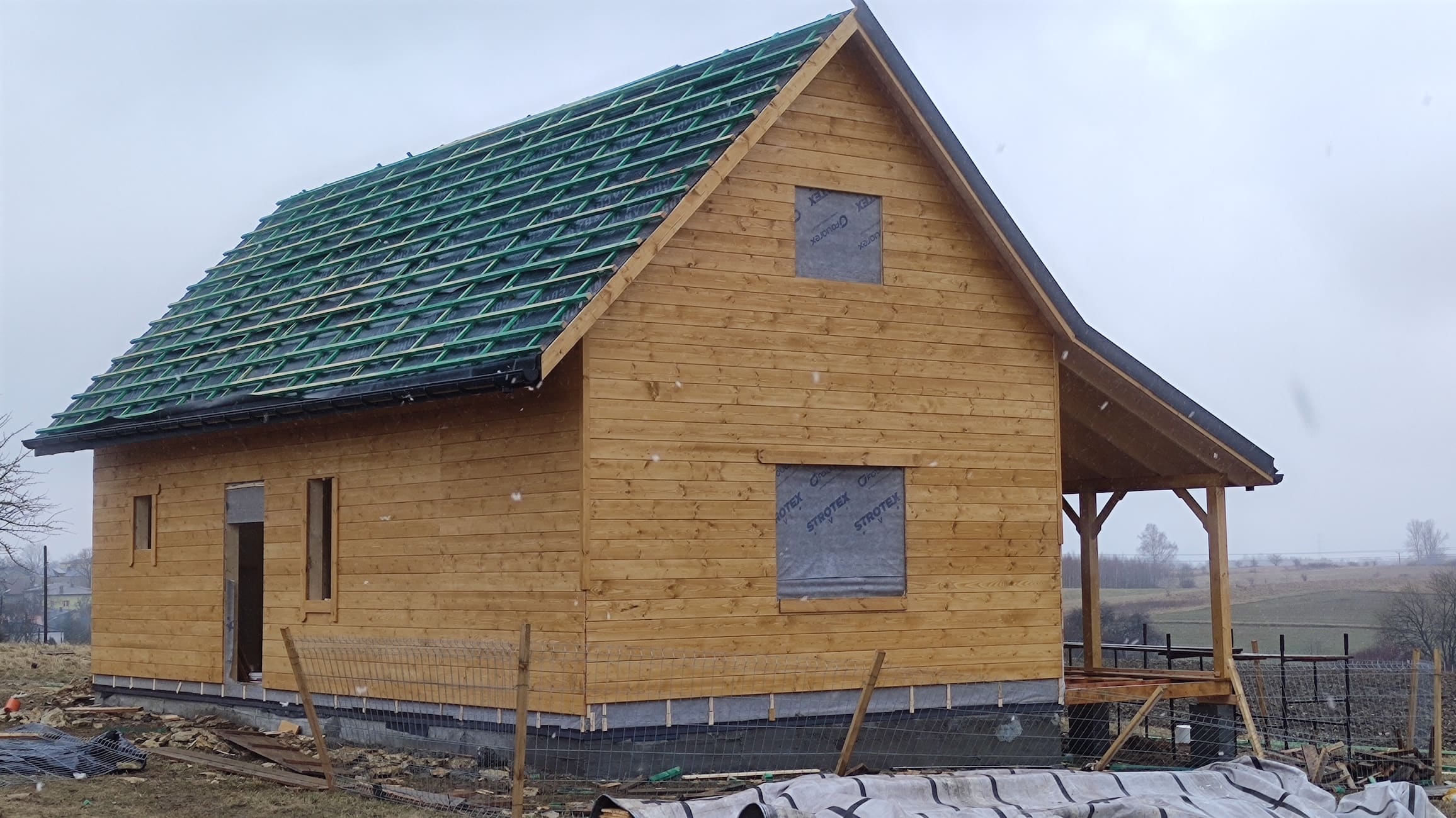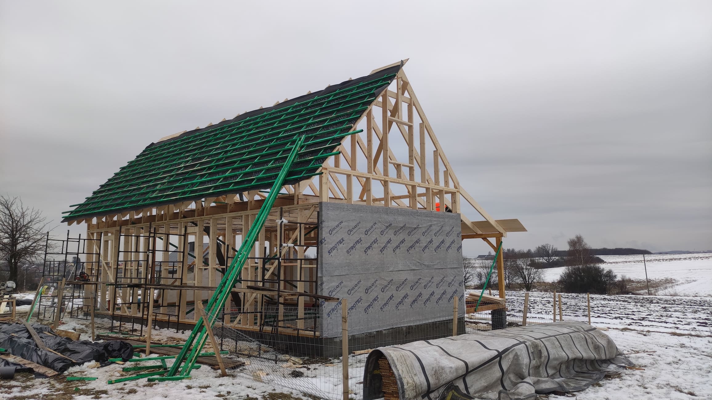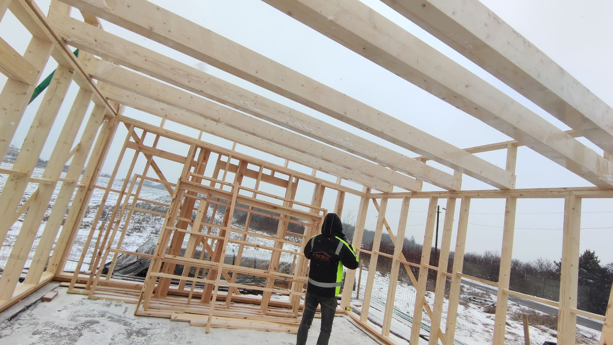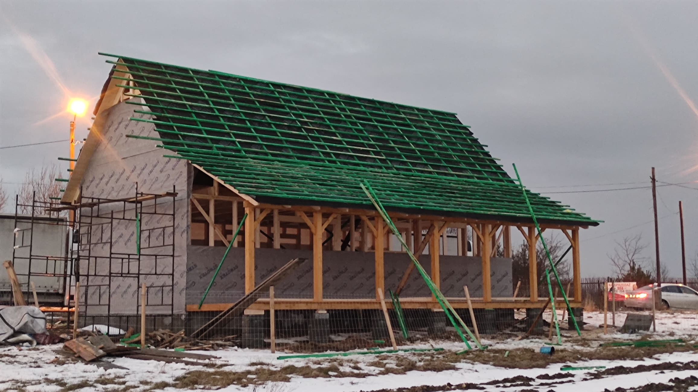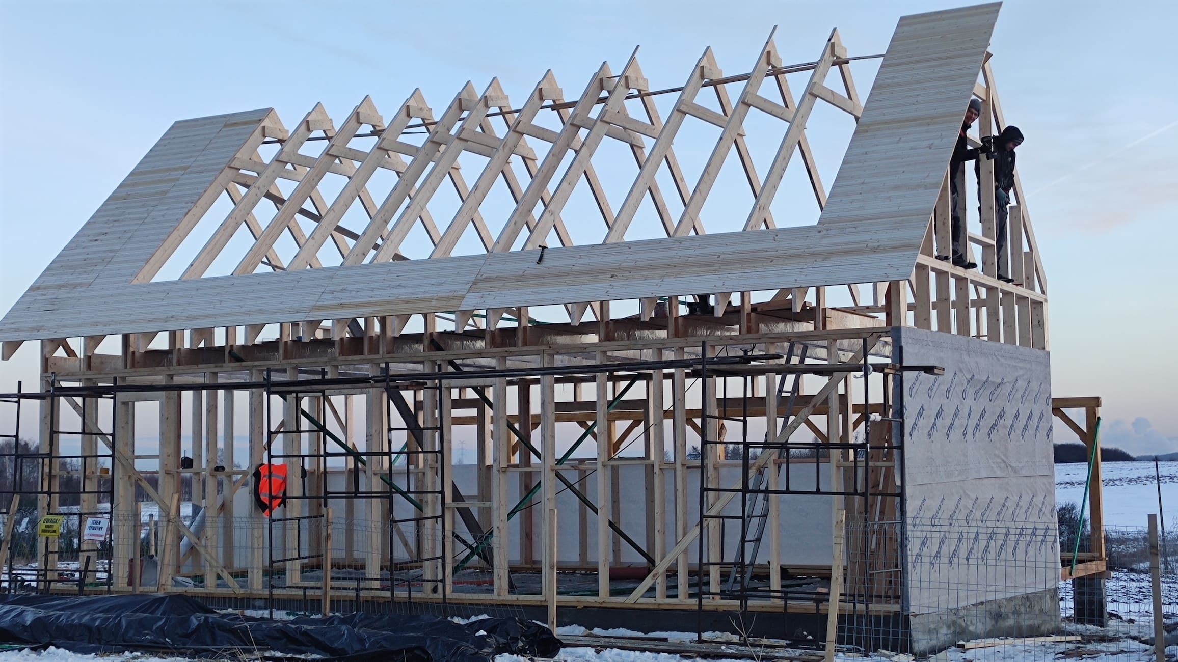 Konstrukcja domu wykonana z drewna świerkowego klasyfikowanego C24 o przekroju 45x145mm /dach 45x195mm