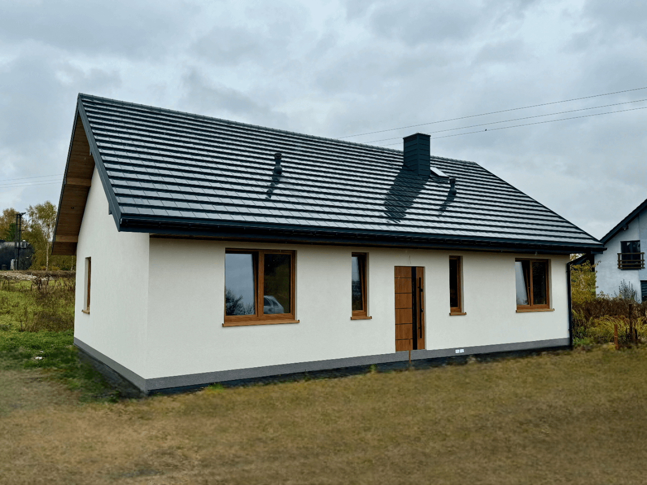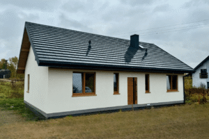 Pokrycie ścian zewnętrznych z płyty Steico Protect 60mm. Dodatkowo tynk silikonowy w wybranym kolorze.