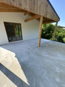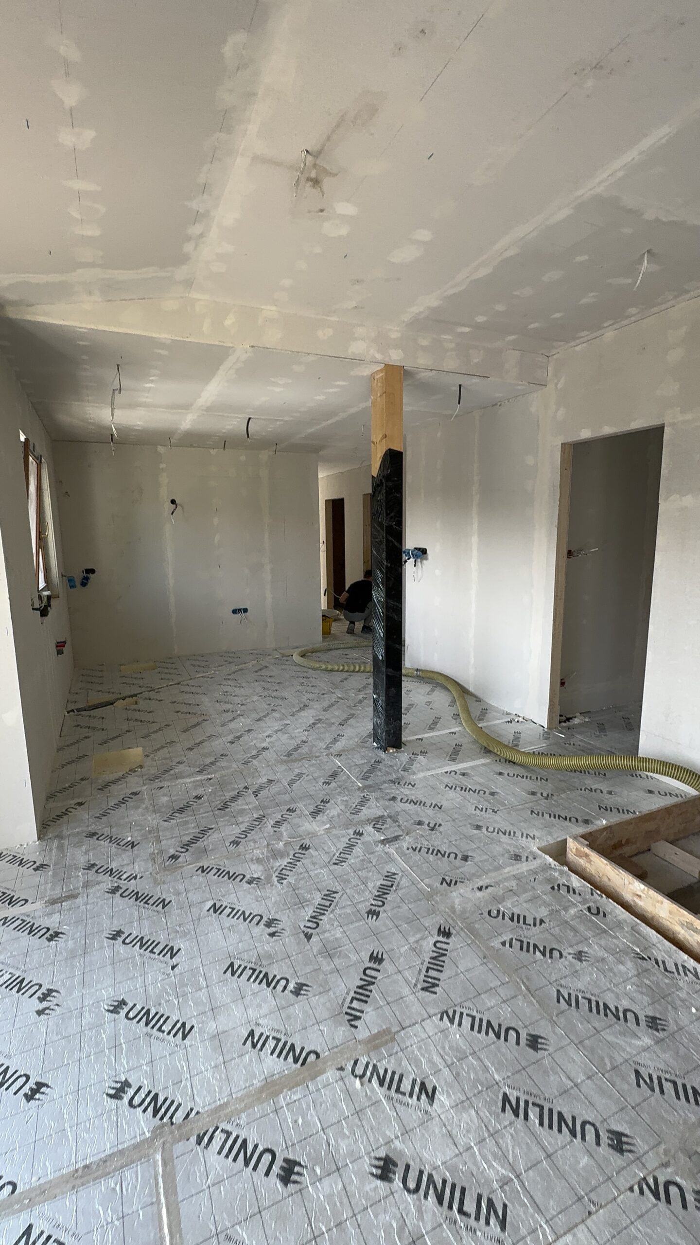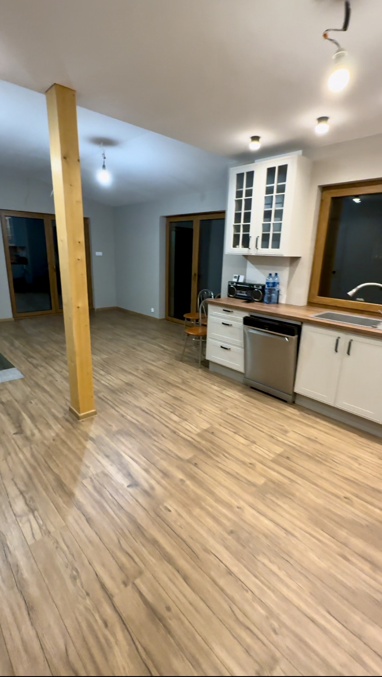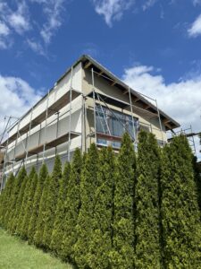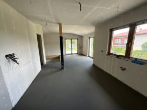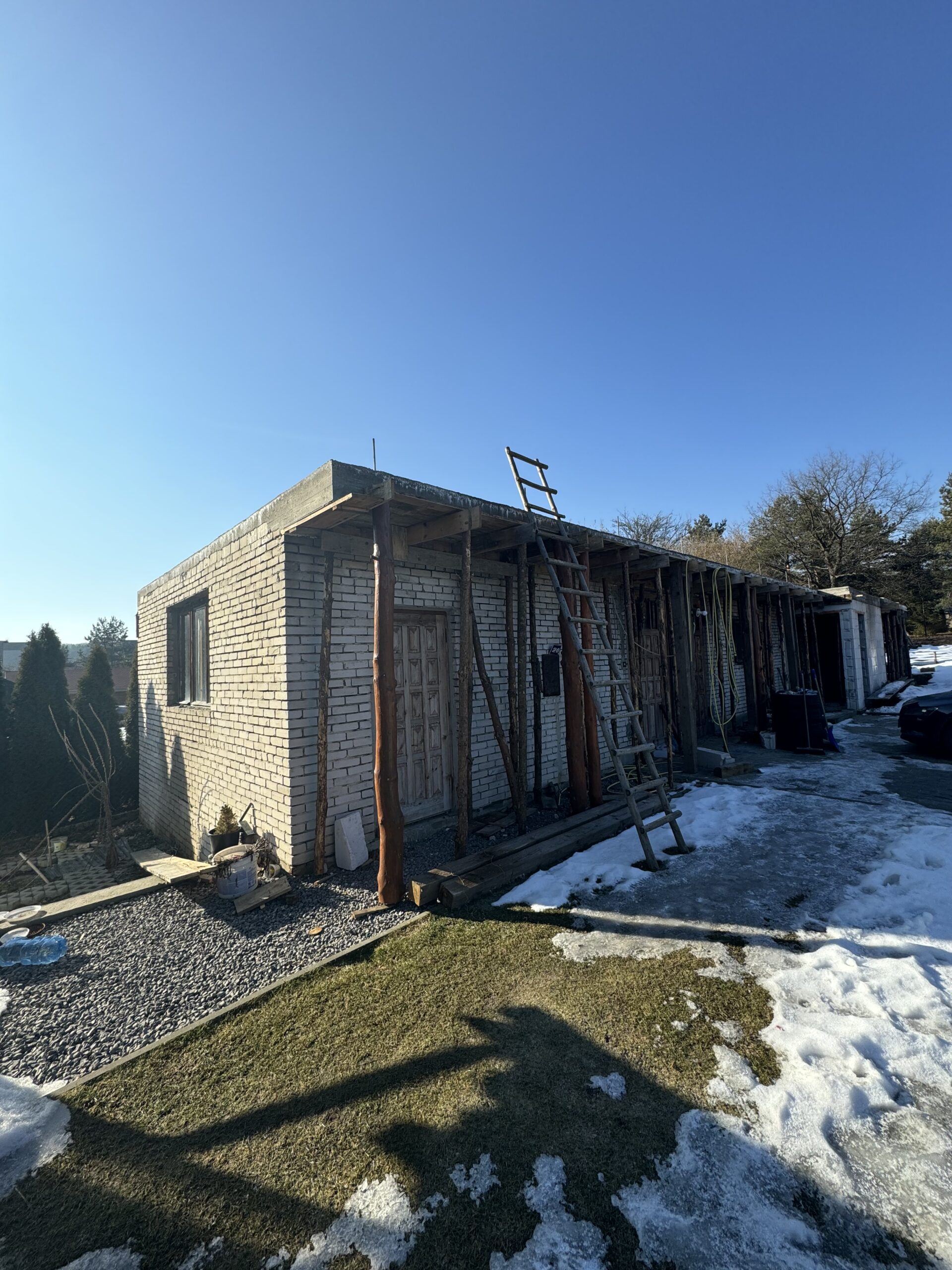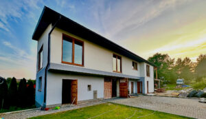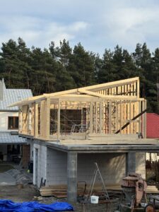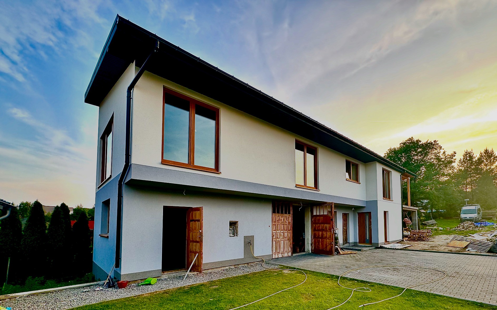 Nadbudowa o powierzchni użytkowej 110 m2 została zrealizowana w oparciu o certyfikowane, wytrzymałe drewno konstrukcyjne, co pozwoliło na bezpieczną rozbudowę murowanego parteru bez nadmiernego dociążania fundamentów. Dzięki zastosowaniu lekkiej, a zarazem sztywnej technologii szkieletowej, budynek zyskał pełnowymiarową i wszechstronną przestrzeń o wysokich parametrach termoizolacyjnych.