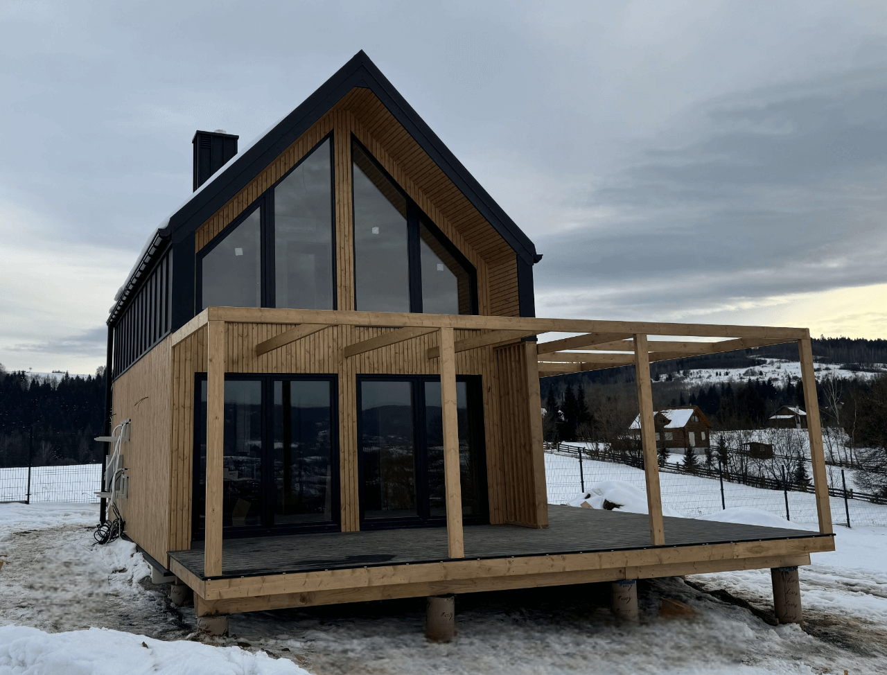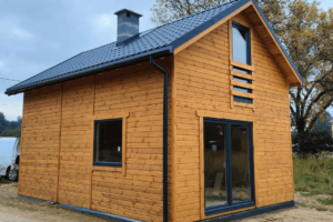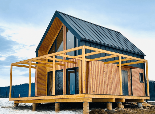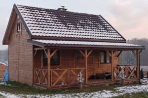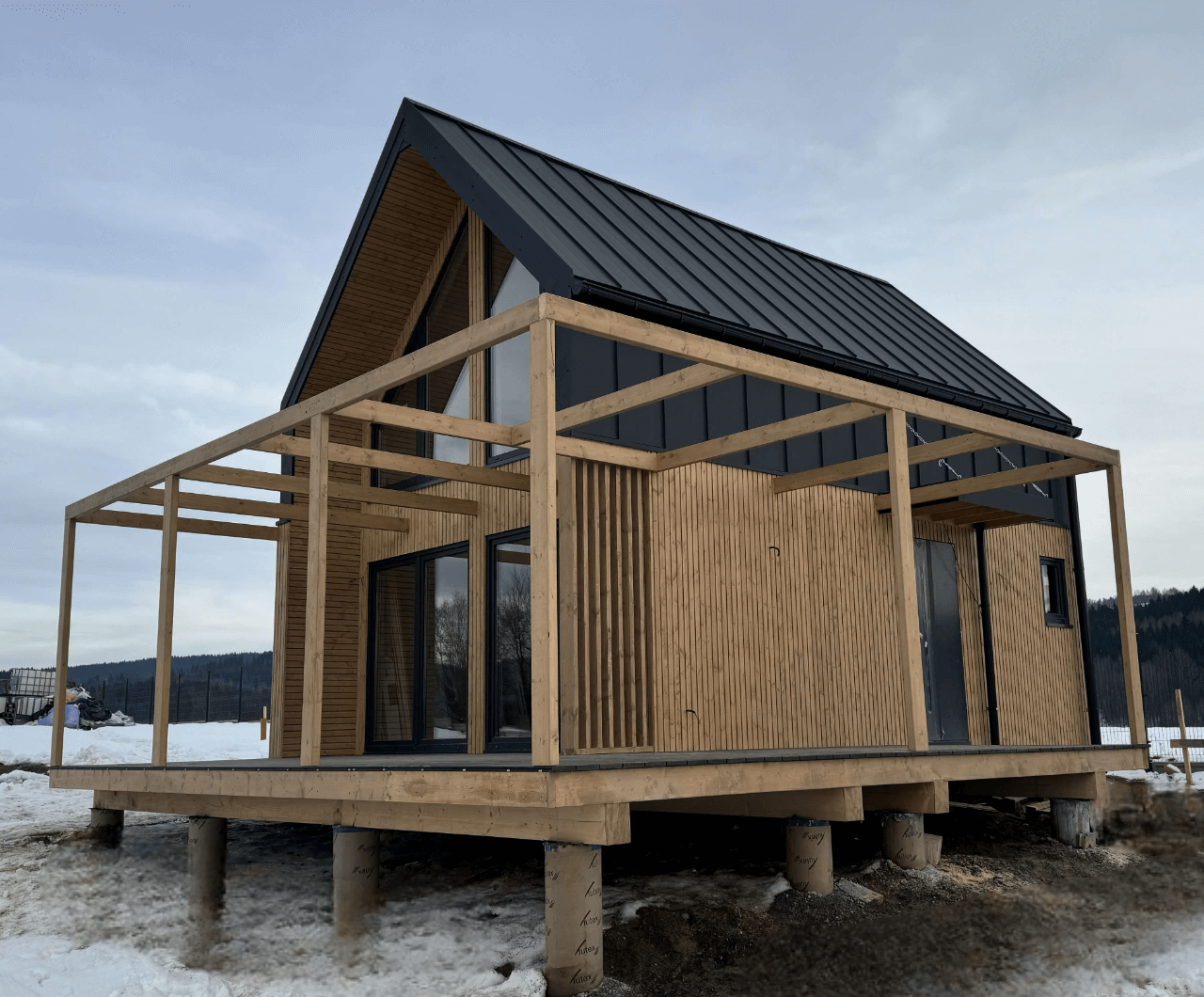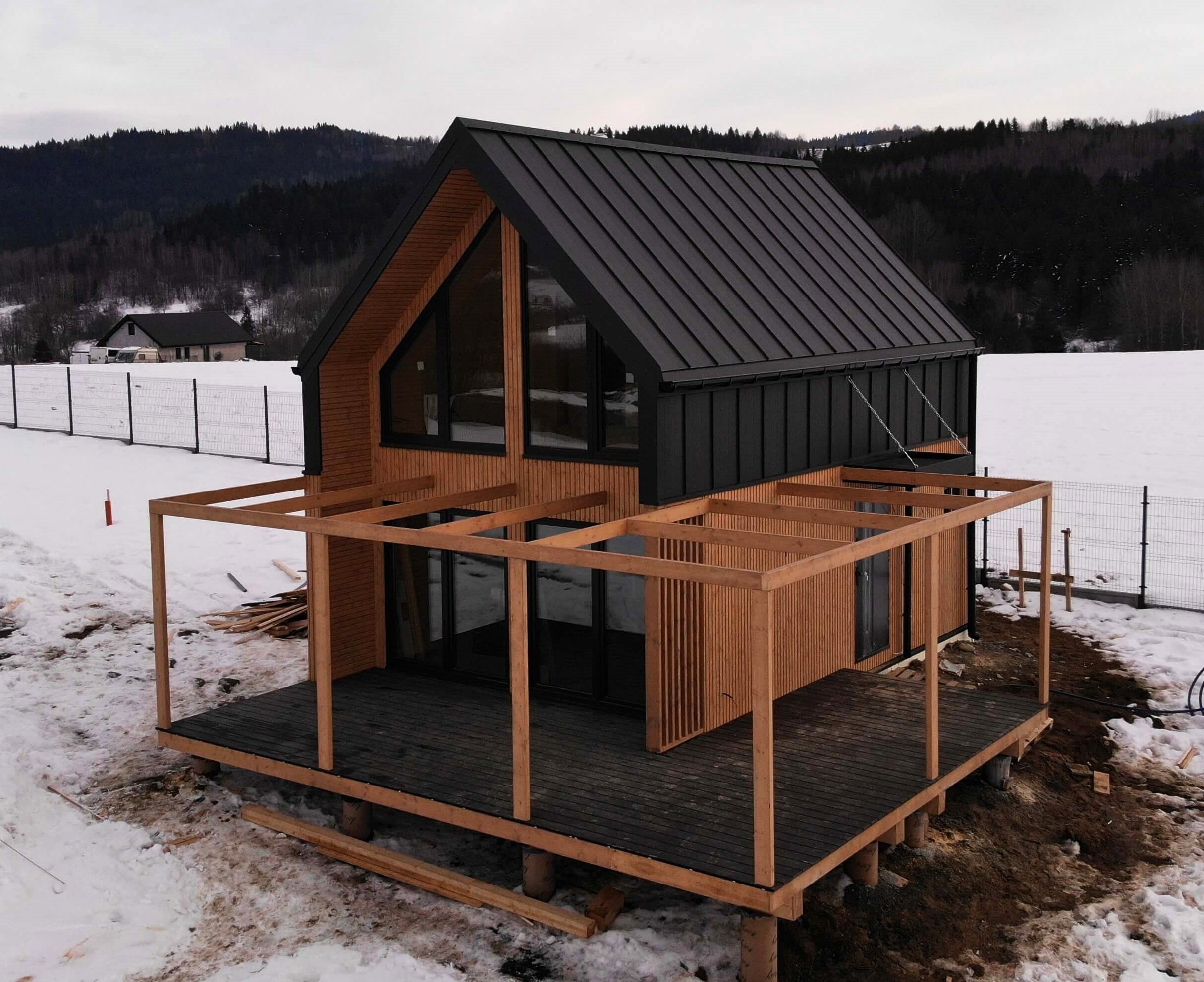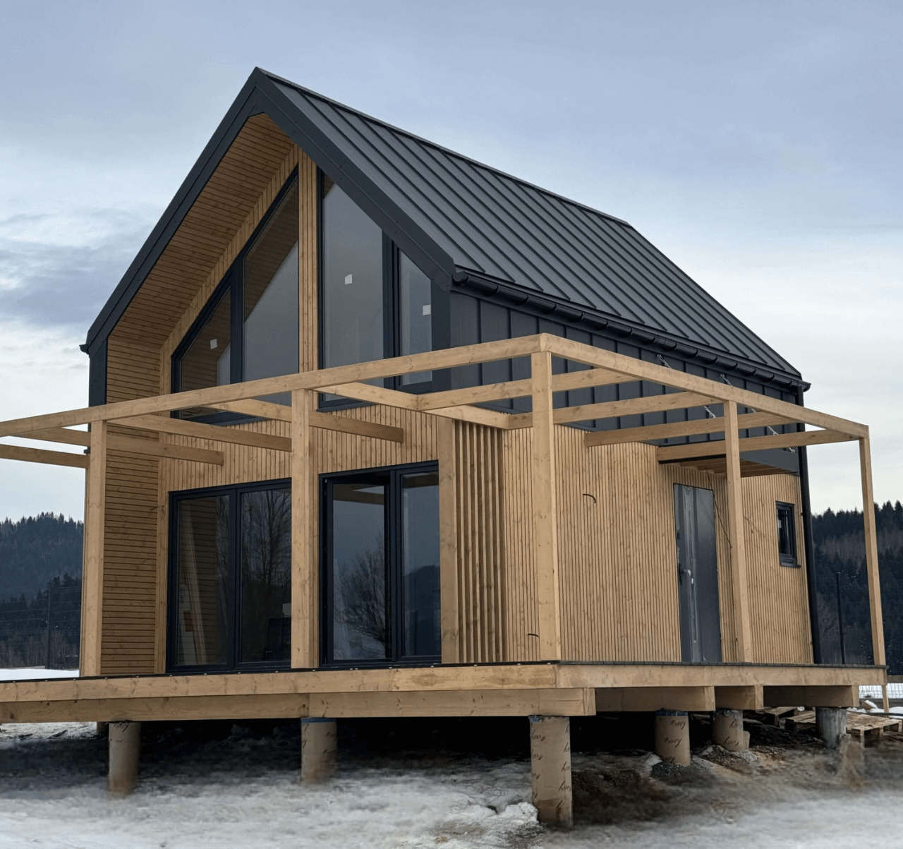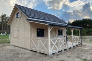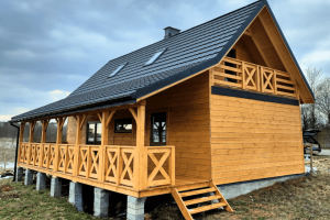 Konstrukcja domu wykonana z drewna świerkowego klasyfikowanego C24 o przekroju 45x145mm /dach 45x195mm