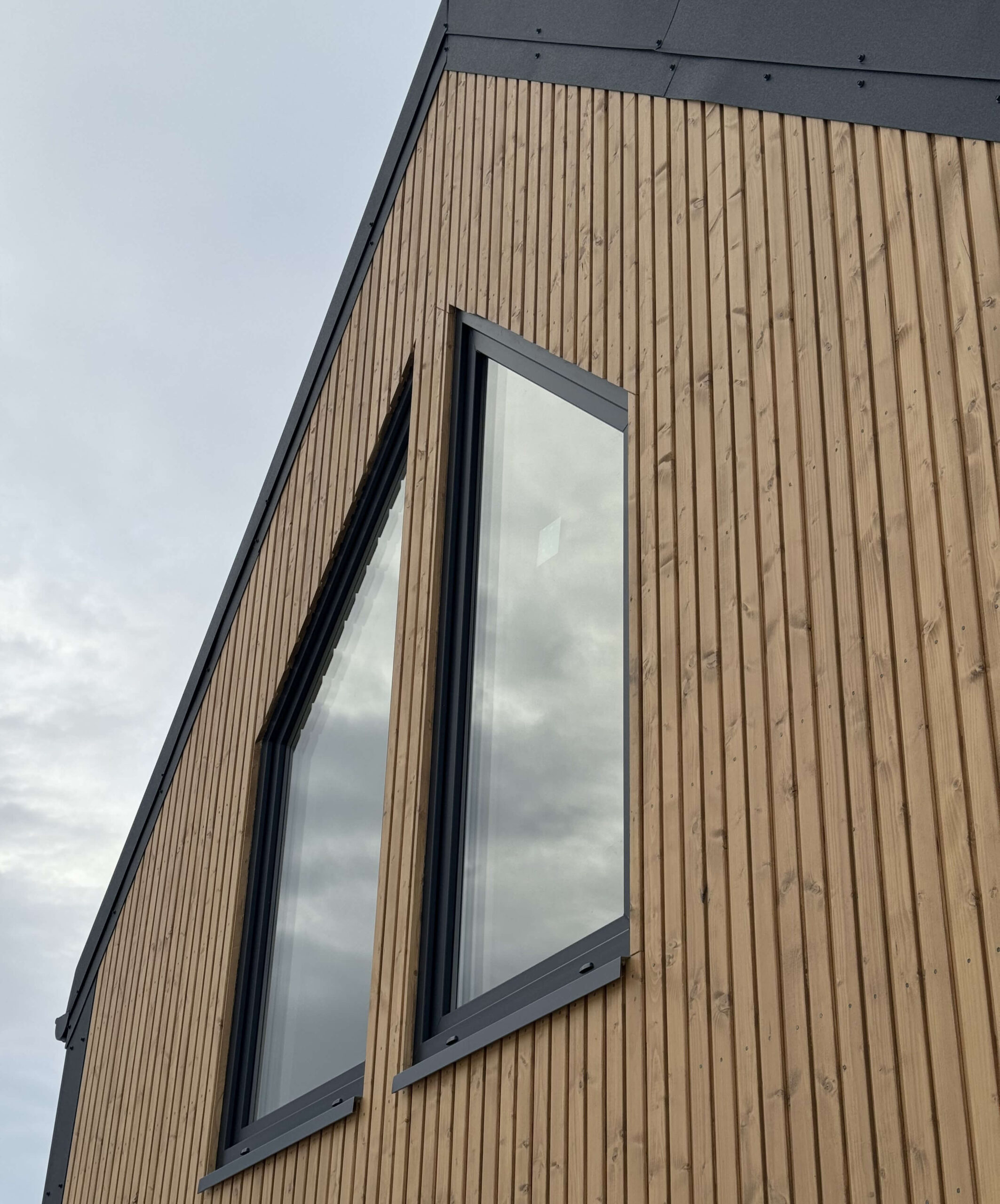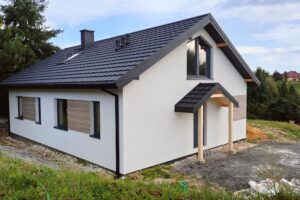 Pokrycie ścian zewnętrznych z płyty Steico Protect 60mm. Dodatkowo tynk silikonowy w wybranym kolorze.
