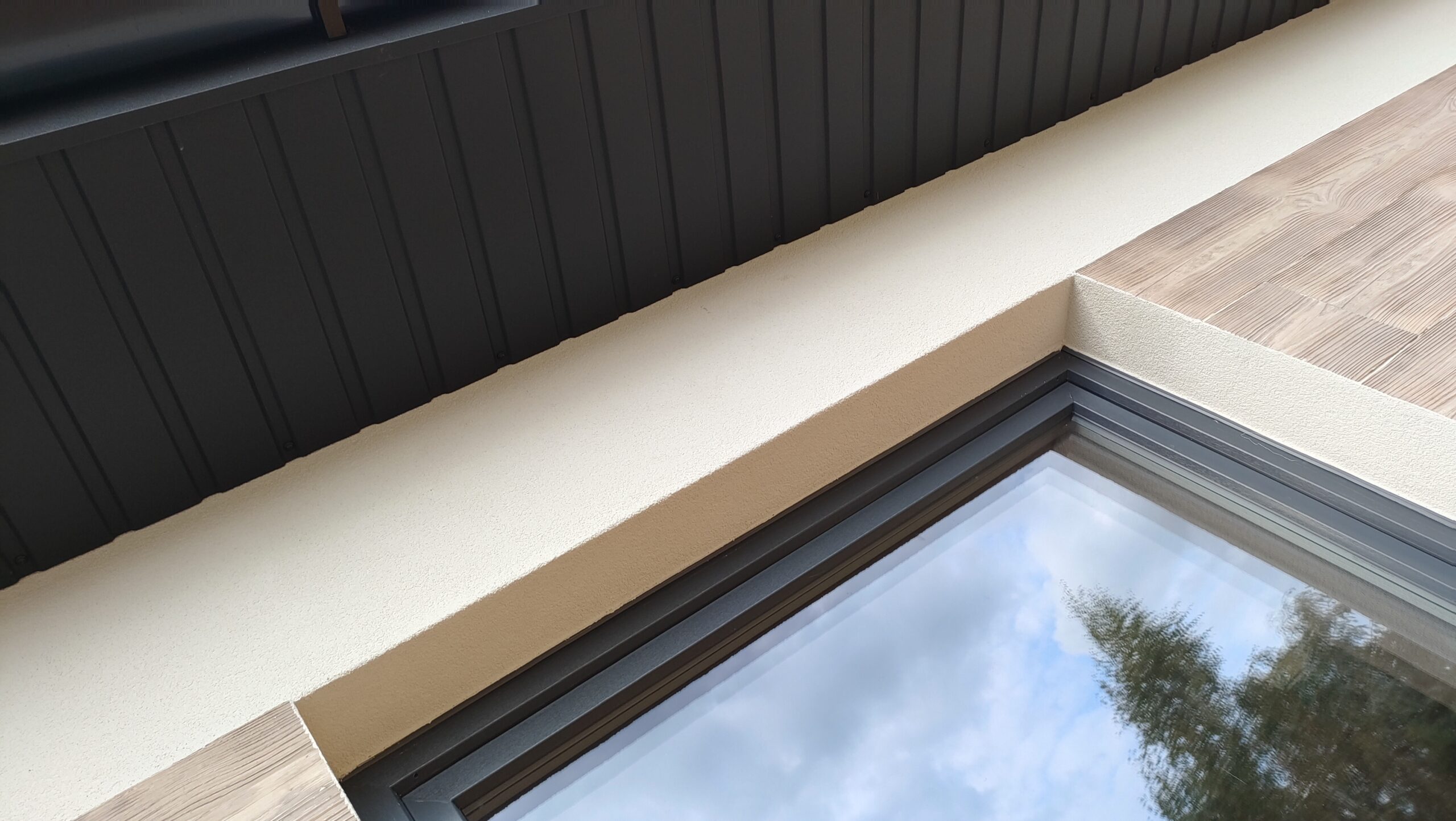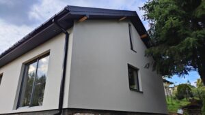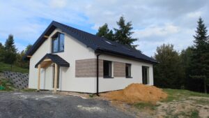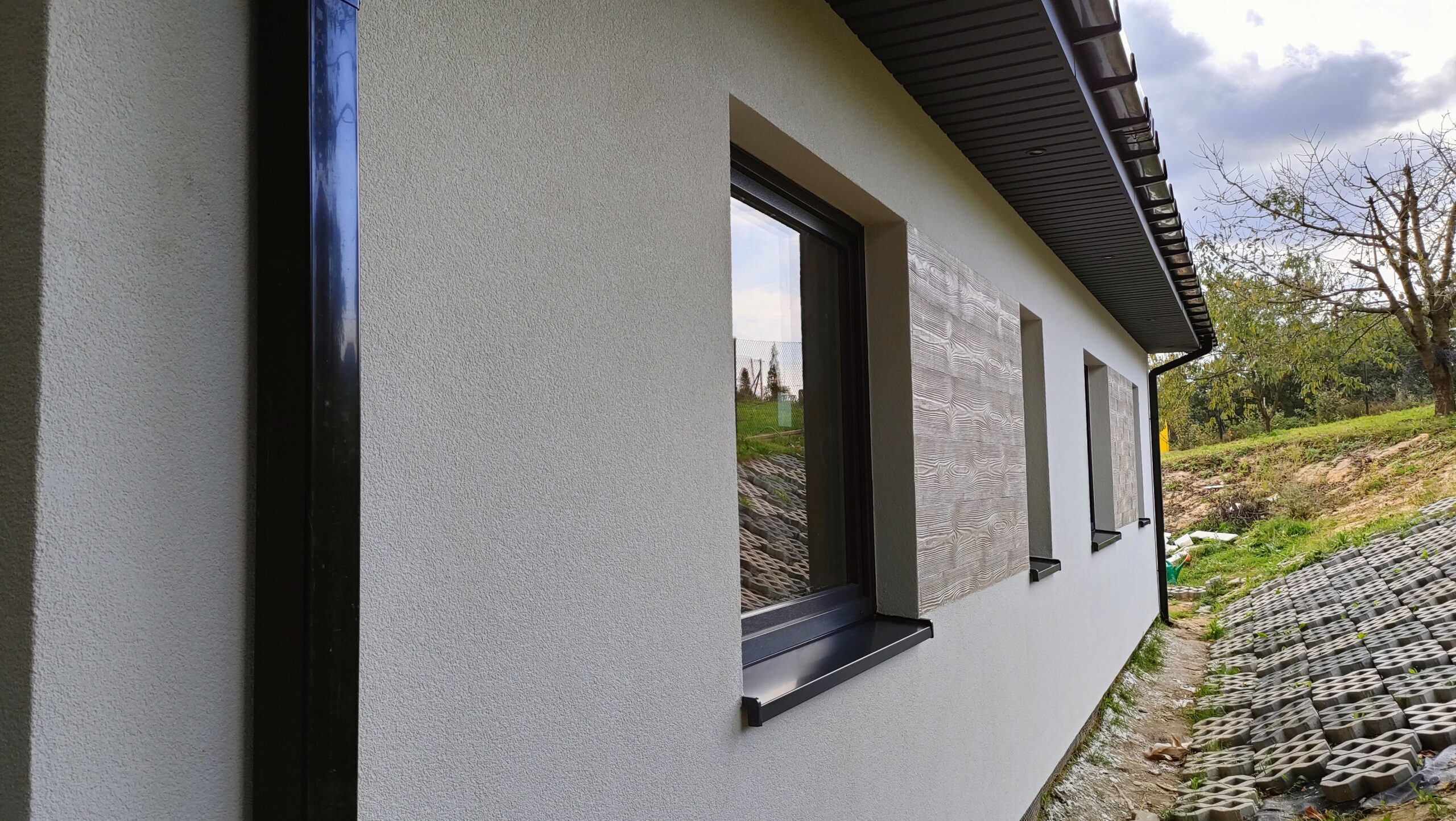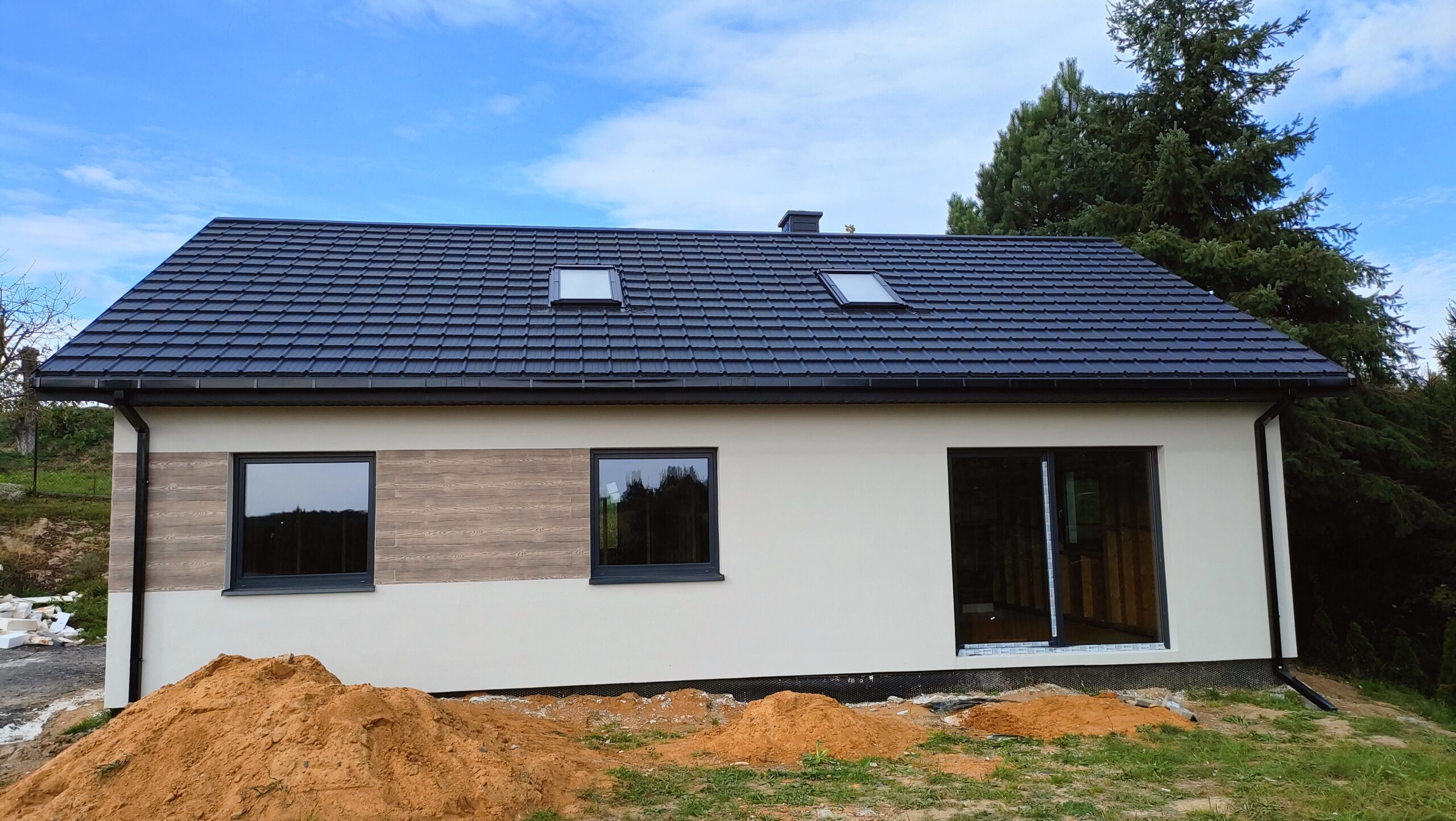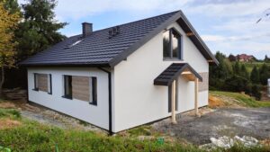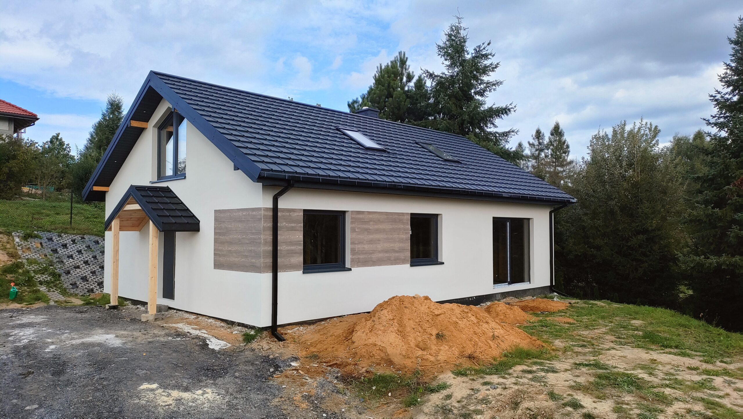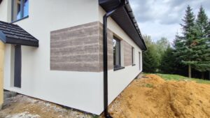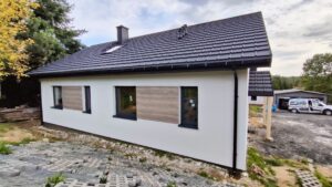 Pokrycie ścian zewnętrznych z płyty Steico Protect 60mm. Dodatkowo tynk silikonowy w wybranym kolorze.